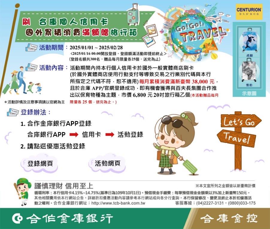 - 活動期間內持本行個人信用卡於國外一般實體商店刷卡(於國外實體商店使用行動支付等導致交易之行業別代碼與本行所指定之代碼不符,恕不適用)。每月累積消費滿新臺幣(以下同)38,000元,且於合庫APP/官網登錄成功,即有機會獲得與百夫長集團合作推出以保育物種為主題,市價6,800元20吋旅行箱乙個。(本活動贈品每月限量各25個,送完為止。)