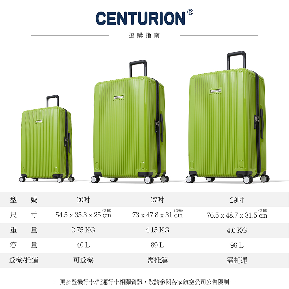 箱體尺寸:31*47.8*73 (cm)(含輪)主要材質:耐衝擊PC+ABS、尼龍箱體淨重:4.15 (kg)箱體容量:89 (L)